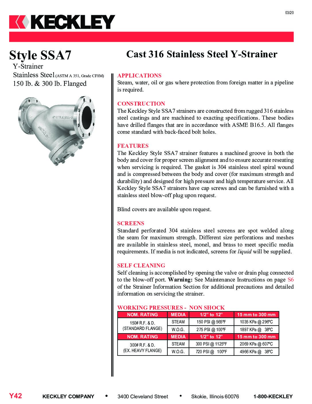 The Keckley style SSA-7 “Y” strainer is fabricated of a 150# ASTM A 351, CF8M 316 stainless steel body with flanged (ASME B16.5) connections and a gasketed cap. Usable in steam pressure applications up to 150 PSIG and 565 F. Usable in water, oil, and gas applications to 275 PSIG at 100 F. All strainers on this page are fabricated from imported castings.