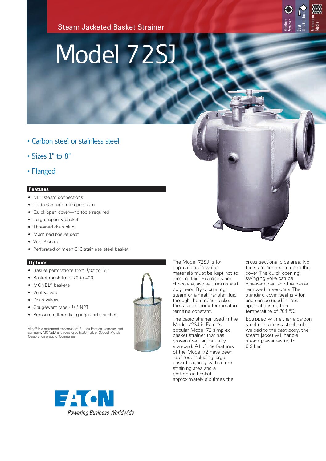 Steam jacketed simplex strainers help keep the process fluid at the desired temperature and the Eaton model 72SJ can handle up to 100 PSI of steam pressure. The model 72SJ is offered in for 1″ to 8″ size pipelines as listed below; we can custom fabricate larger size steam jacketed basket strainers for pipelines up to 60″.