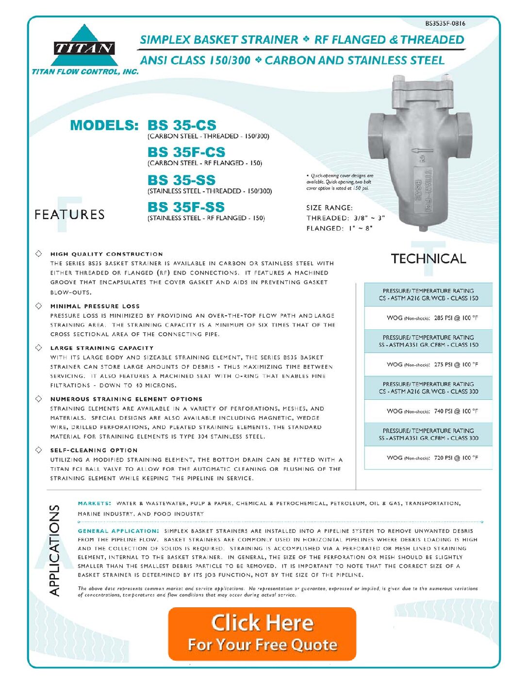 Titan BS35 simplex basket strainers are an inexpensive version of a cast carbon steel basket strainer. Available in 3/8″ to 8″ sizes, the Titan BS35 has a bolted basket chamber cover (thus requires tools to remove) and a drain plug.
