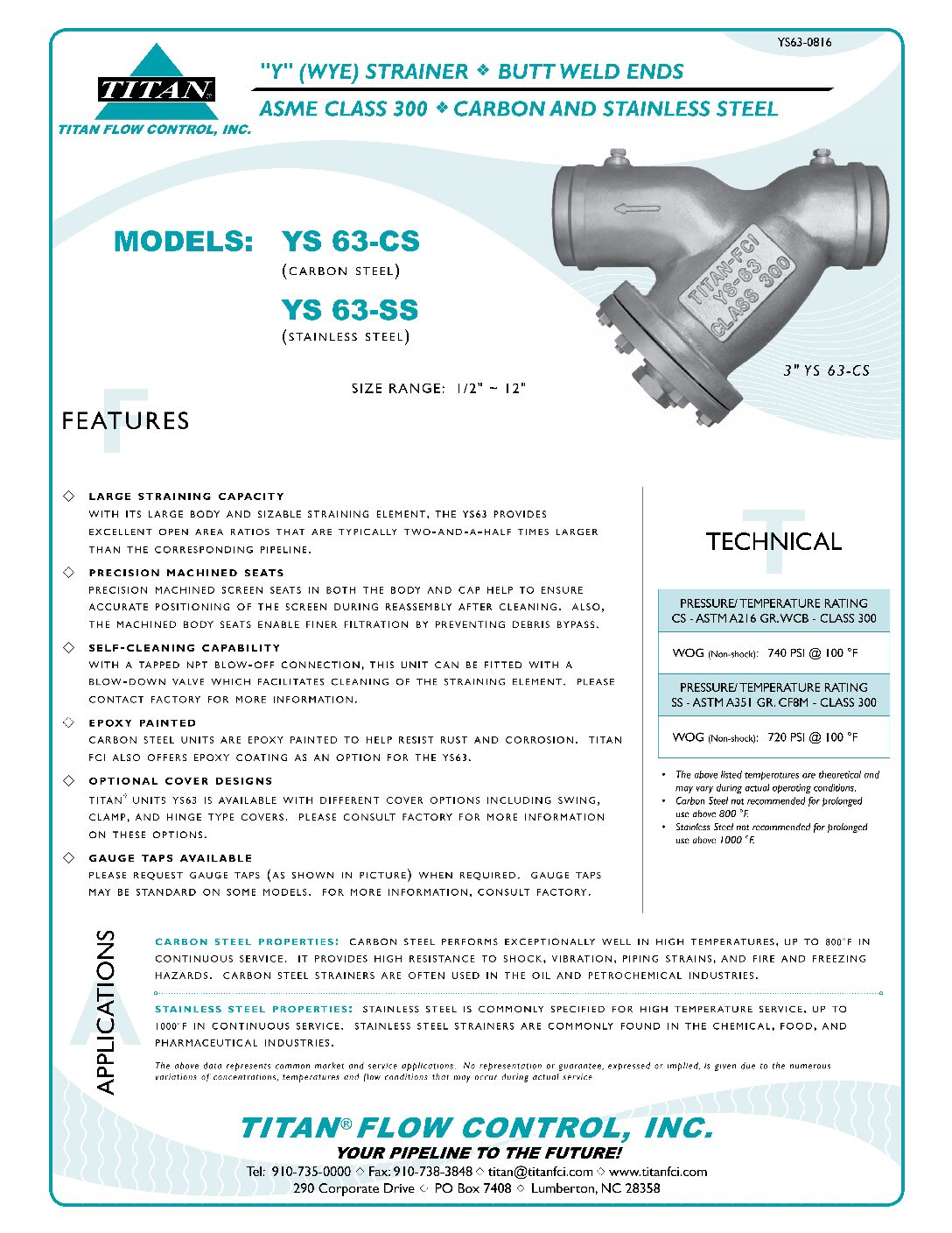 YS63-1214. ®. TITAN. PRESSURE – TEMPERATURE RATINGS. BILL OF MATERIALS(1). No. PART. YS 63-CS (5). YS 63-SS. 1. Body (2). Carbon Steel. A216 Gr. WCB. Stainless .