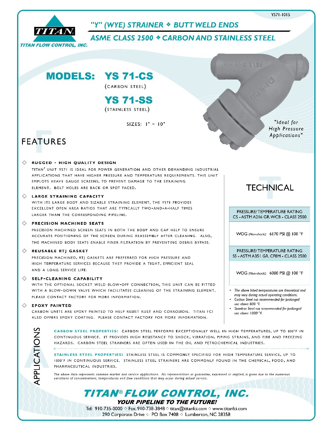The Titan Flow Control Model YS71-CS is an epoxy painted ASME Class 2500 carbon steel Wye Type Y Strainer with Schedule XXS butt weld ends.