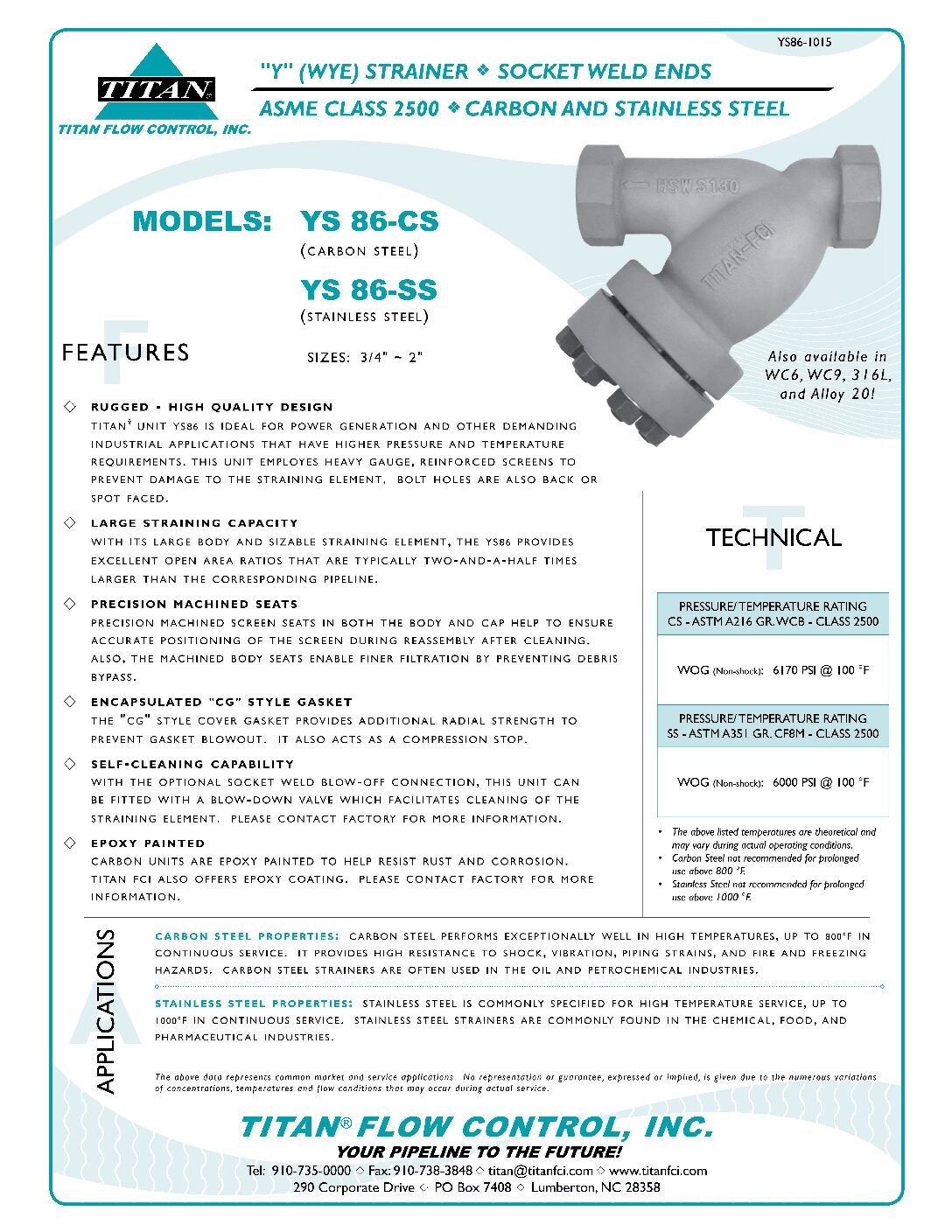 Titan YS86-CS Carbon Steel Y Strainer, Model, Body Material, ANSI Class ; Titan YS86-CS Carbon Steel Y Strainer · YS 86-CS, Carbon Steel A216 Gr. WCB, 2500