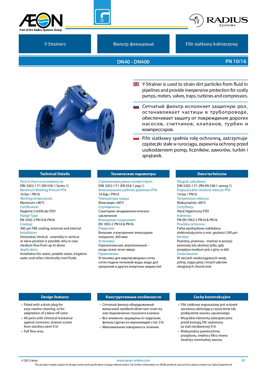 Ductile Iron Y strainer, flanged rising face, Bolted cover with Drain Plug, Internal Screen Stainless steel, Pressure Rating PN 16. Brand Aeon Poland